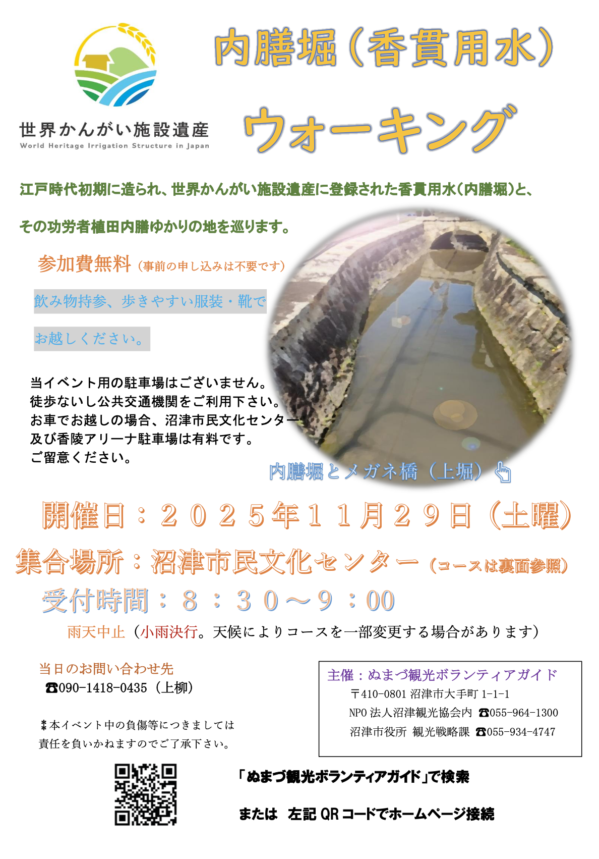ぬまづ観光ボランティアガイドによるウォーキングイベント「内膳堀(香貫用水)ウォーキング」が、2025年11月29日(土)に開催されます。沼津市民文化センターを発着点に、内膳堀を巡りながら散策を楽しめるイベントです。