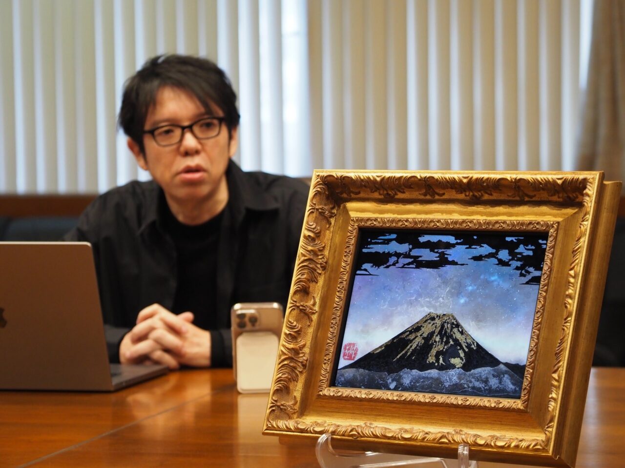 当日は NAKANO さんより、ご自身が手がけるメディアアートの紹介がありました。NAKANO さんの作品は、日本画で用いられる「岩絵具」「水干(すいひ)絵具」「墨」と、アニメ制作で培った CG(デジタル彫刻)を融合させたものです。このコンテンツを独自開発のシステムで表示し、実用新案登録した特殊額縁を用いるという“三つの組み合わせ”によって構成されており、その独自性が高く評価されています。